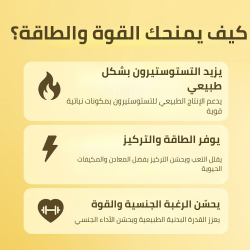 منتجنا ثبتت فعاليته في دعم صحة الرجل بشكل شامل، حيث يعمل على زيادة مستويات هرمون التستوستيرون وتحسين الصحة الجنسية، مع المساهمة في بناء الكتلة العضلية وزيادة الطاقة والتحمل البدني. كما يعزز التركيز والوضوح الذهني، ويساعد على تنقية الجسم من السموم وتقوية جهاز المناعة، إضافةً إلى دوره في تقليل مستويات التوتر والقلق لمنحك إحساسًا دائمًا بالقوة والحيوية.